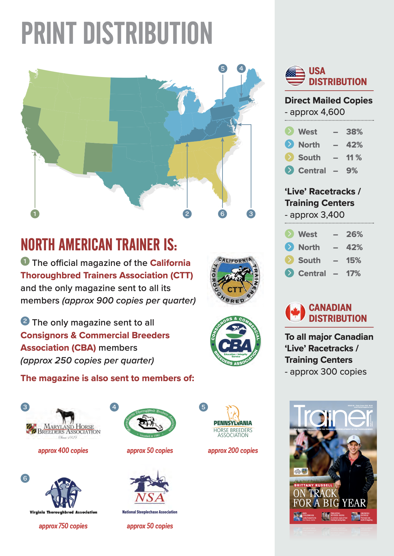 Approximately 4,600 magazines are distributed via regular mail, to the home addresses and offices of trainers, leading owners, breeders, stud farms, industry professionals and subscribers across North America. The balance - 3,400 are distributed to live racetracks / training centers.